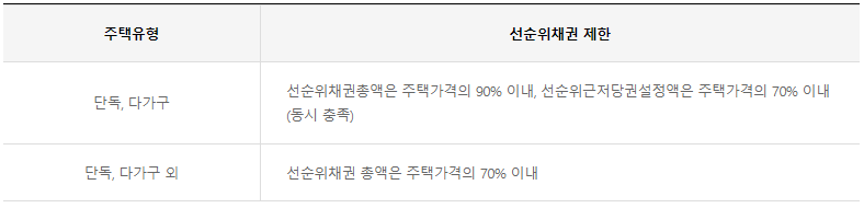 ② 보증목적물별 보증한도 : 주택가격의 90% - 선순위채권 총액(선순위근저당권설정액과 선순위임대차보증금의 합)