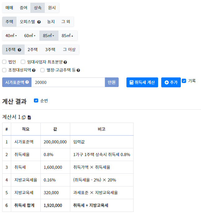 ▶취득세 계산기 (예시. 2억원 주택 상속 시 취득세)