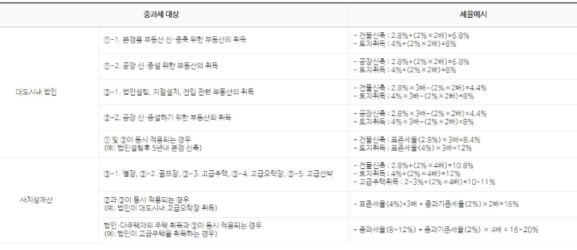 취득세율에는 특정한 경우에 세금을 무겁게 물리기 위해서 높여놓은 중과세율도 있습니다. 조세특례의 하나인 중과세의 세율로 과밀억제권역에서 본점이나 주사무소의 사업용 부동산을 취득하거나 공장을 신설하거나 증설하기 위해 사업용 과세물건을 취득하는 경우, 별장/골프장/고급주택/고급오락장/고급선박을 취득할 경우 등에는 각각 중과세를 받게 되는데, 이때 적용되는 세율이 중과세율입니다.