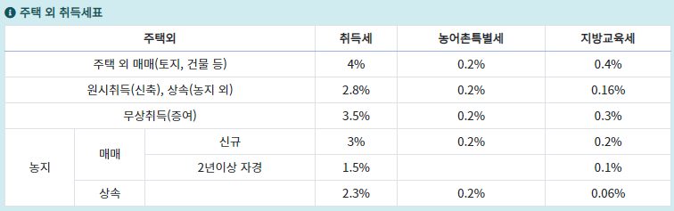 ▶ 부동산 취득 : 2.3%~4%, 무상취득 2.3~3.5%, 원시취득 2.8%, 유상취득 4%(농지 3% 등)