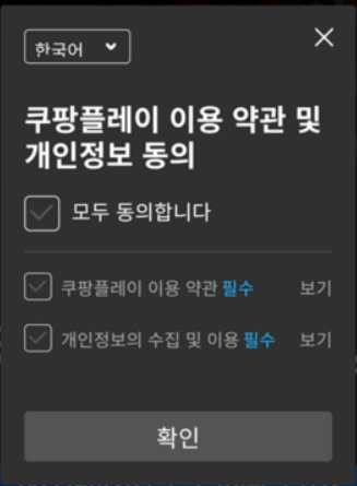 쿠팡플레이 이용 약관 및 개인정부 수집 동의를 읽어 보신 후 체크박스를 클릭하신 후 '확인' 버튼을 클릭해주시면 되십니다.