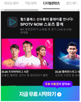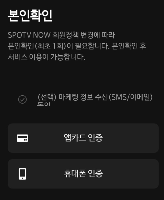 SPOTV NOW 최초 1회 본인인증 확인이 필요하며, 앱카드, 휴대폰 인증을 통해서 하시면 됩니다.