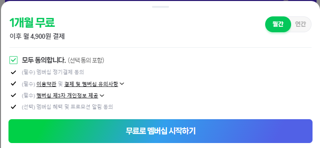 1. 네이버 플러스 멤버십 '지금 무료 시작하기' 를 클릭하신 후 '모두 동의합니다' 선택 후 '무료 멤버십 시작하기' 버튼을 클릭해주시면 됩니다.