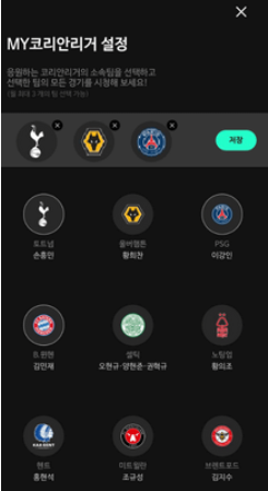 5. MY 코리안리거 설정은 최대 3개의 팀으로 한달에 한번만 설정을 변경하실 수 있습니다. 원하시는 팀을 선택하신 후 저방버튼을 클릭해주시면 됩니다.