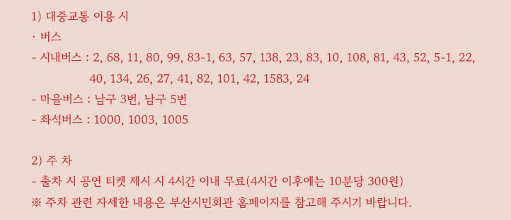 📢 공연장 주변 교통이 매우 혼잡할 수 있습니다. 공연 당일 교통상황이나 주차로 인한 공연 취소 및 환불, 변경은 불가하니 이점 유의하시어 가급적 대중교통 이용 부탁드립니다.