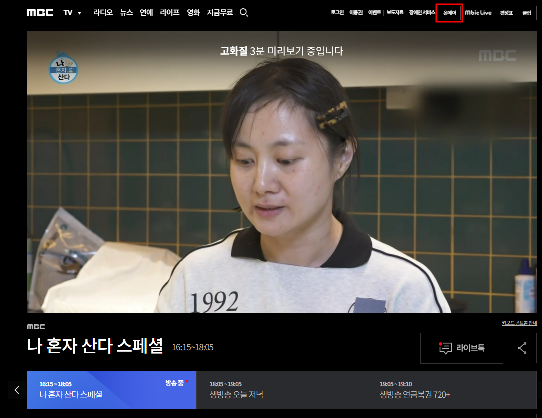 ▶ MBC 온에어 상단에 있는 '온에어' 를 클릭하시면 실시간으로 방송을 시청하실 수 있습니다.