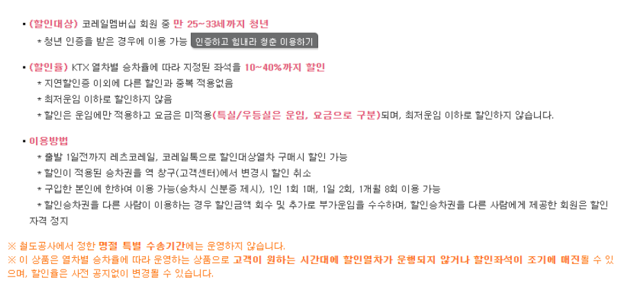 힘내라 청춘 상품은 만25~33세 청년들이 사용할 수 있는 상품 입니다. 이상품은 최대 40%까지 할인 됩니다. 힘내라 청춘은 청소년드림과 다르게 특실에도 적용되니 특실 자리를 최대 40%할인 받고 이용 할 수 있는 장점이 있습니다.