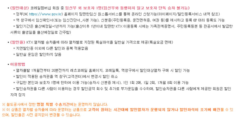 맘편한 KTX는 임산부와 같이 동반한 사람에게도 혜택을 주는 상품입니다. 이상품은 좌석을 할인해준다기보단 일번좌석을 특실로 업그레이드 시켜주는 상품입니다. 맘편한 KTX를 이용하가 위해선 역 창구에서 임신확인서 & 신분증을 제시하고 등록하거나 정부24 홈페이지에서 맘편한 임신 원스톱 서비스를 통해 온라인 신청도 가능합니다.