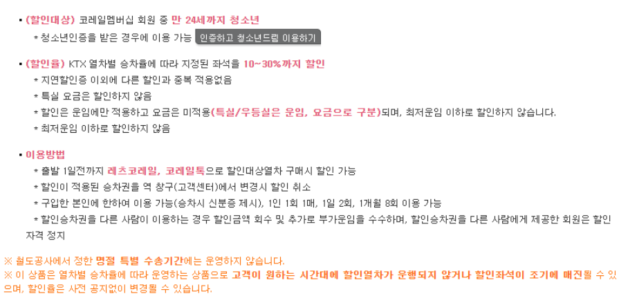 청소년드림 상품은 만 24세 까지만 사용할 수 있는 상품입니다. 당연히 코레일가입은 되어 있어야 합니다. KTX열차별 승차율에 따라 10~30%할인 된 좌석을 선택할 수 있습니다. 단, 특실은 할인되지 않습니다. 이용방법은 최소 출발 하루전에 코레일 홈페이지나 어플을 통해 예약해야됩니다.