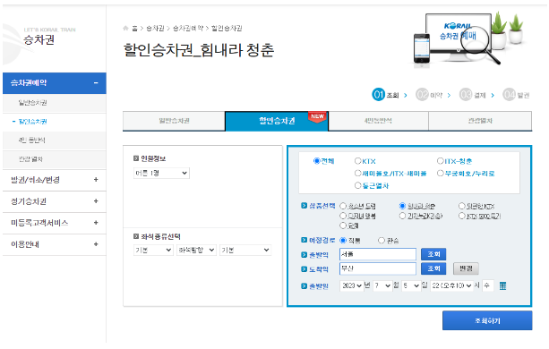 ▶ 승차권 예약-할인승차권을 선택하시면 상품선택이 가능합니다. 그중 가장 많이 사용하는 상품인 청소년 드림, 힘내라 정춘, 맘편한 KTX에 대하여 알려드리도록 하겠습니다.