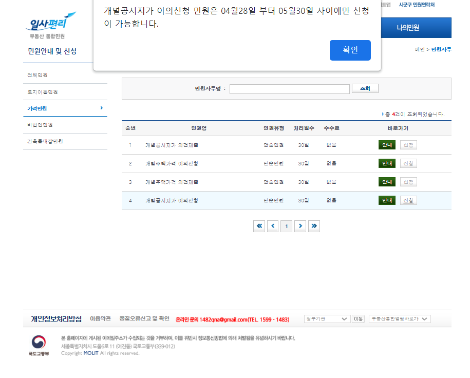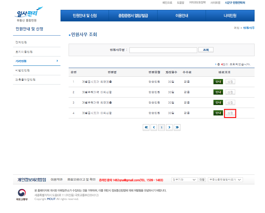 ▶ '가격민원' 버튼을 클릭하신 후 개별공시지가 이의 신청에서 '신청'버튼을 클릭해주시면 됩니다.