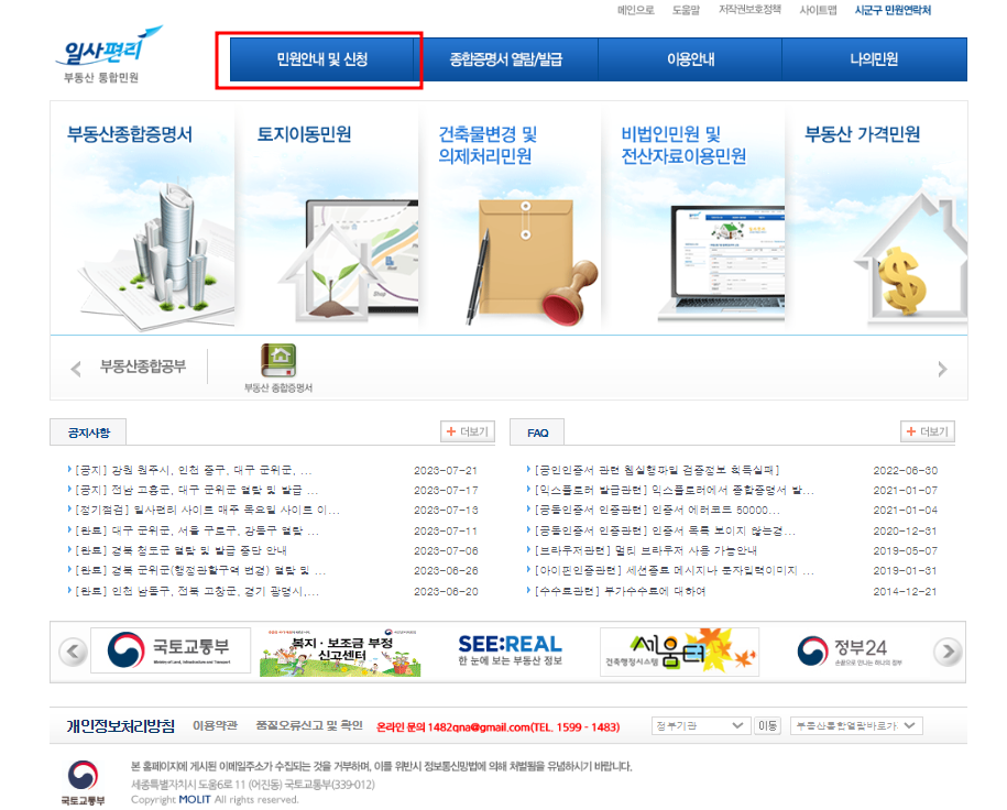 ▶ '민원안내 및 신청'버튼을 클릭해주시면 됩니다.
